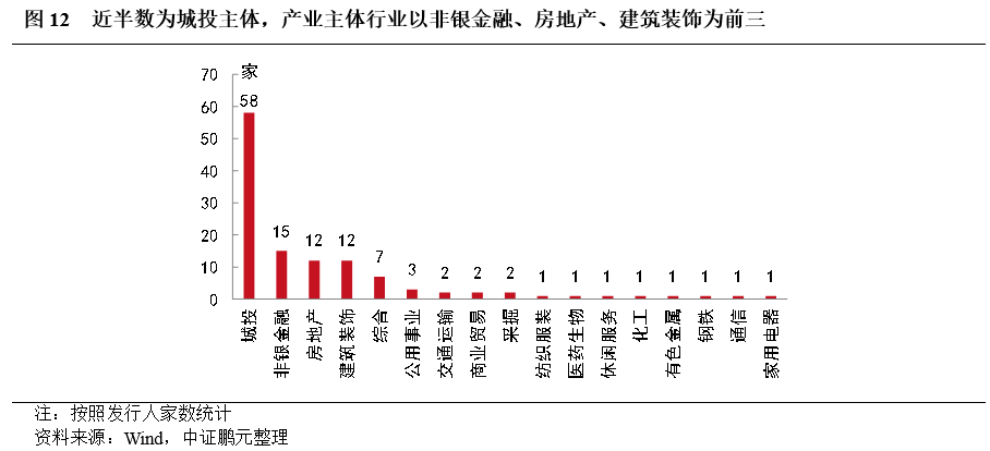 從行業來看,近半數為城投主體,共58家,占比為47.9%。產業類主體共63家,占比為52.1%,產業主體占比略超城投,但行業較為分散,分布最多的為非銀金融,共15家,占產業類主體比例為23.8%,其次為房地產和建筑裝飾,均為12家,分別占比19.0%,綜合、公用事業分別為7、3家,剩余11個行業均為1至2家(圖12)。