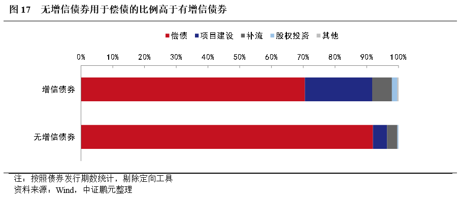 對于資金用于償債是否會導致被要求采取增信措施的可能性,我們對比了同時期發行的無增信債券的資金用途。數據顯示,超過90.0%的無增信債券募集資金用于償還到期債券和債務,償債用途的比例高于有增信債券(圖17)。從這一數據角度看,不支持資金用于償還債務會導致被要求采取增信措施的結論。