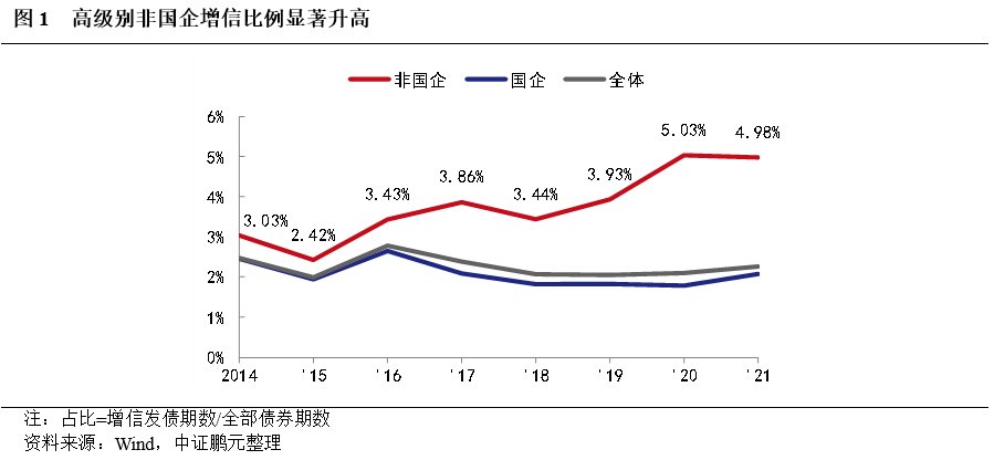 近年來,高級別主體(主體評級為AA+或AAA)增信發債的數量逐漸增多,特別是高級別的非國有企業增信發債的比例逐漸提高。