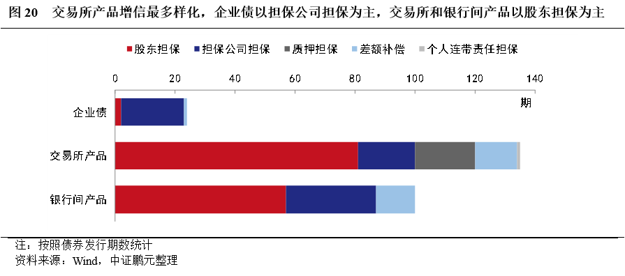 2.交易所產品增信方式最多樣化,企業債以擔保公司擔保為主,交易所和銀行間產品以股東擔保為主