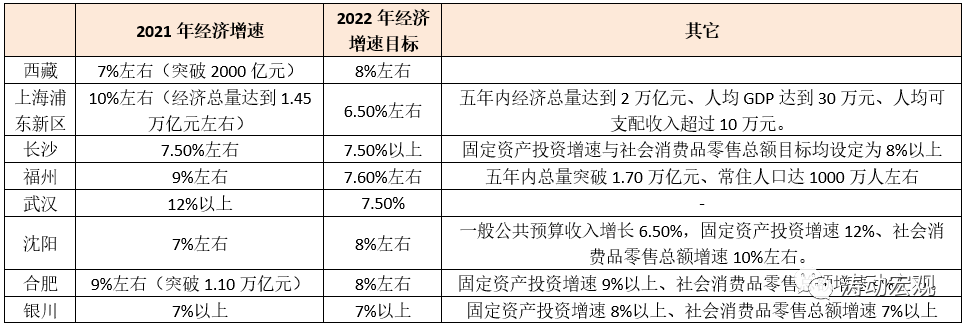 3、除北京與上海浦東新區外,長沙、福州、武漢、沈陽、合肥和銀川等6個省會城市均將2022年的經濟增速設定在7%以上。