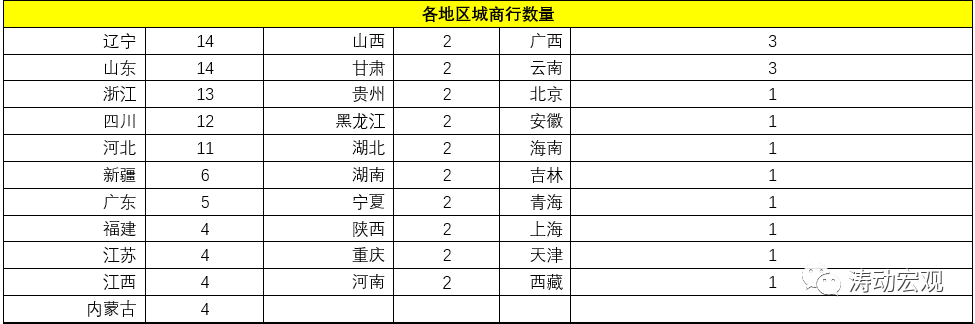 (3)另有10個地區(qū)分別擁有2家城商行,8個地區(qū)分別擁有1家城商行。