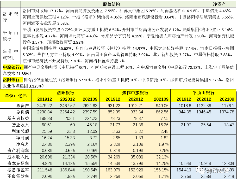 從公開披露的信息來看,三家被合并銀行的股權(quán)關(guān)系比較復(fù)雜,民營成分較濃,同時其資產(chǎn)質(zhì)量均比較一般。例如截至2021年9月,洛陽銀行、焦作中旅銀行與平頂山銀行的不良貸款率分別為2.74%、1.71%和2.21%,而撥備覆蓋率僅分別為190.54%、155.15%和161.69%,整體實力偏弱。