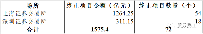 2022年2月終止的債券項目(小公募、私募債和ABS)金額合計為1575.40億元,終止項目數量72個。其中上海證券交易所終止金額為1264.25億元,占比為80.25%;深圳證券交易所終止金額為311.15億元,占比為19.75%。