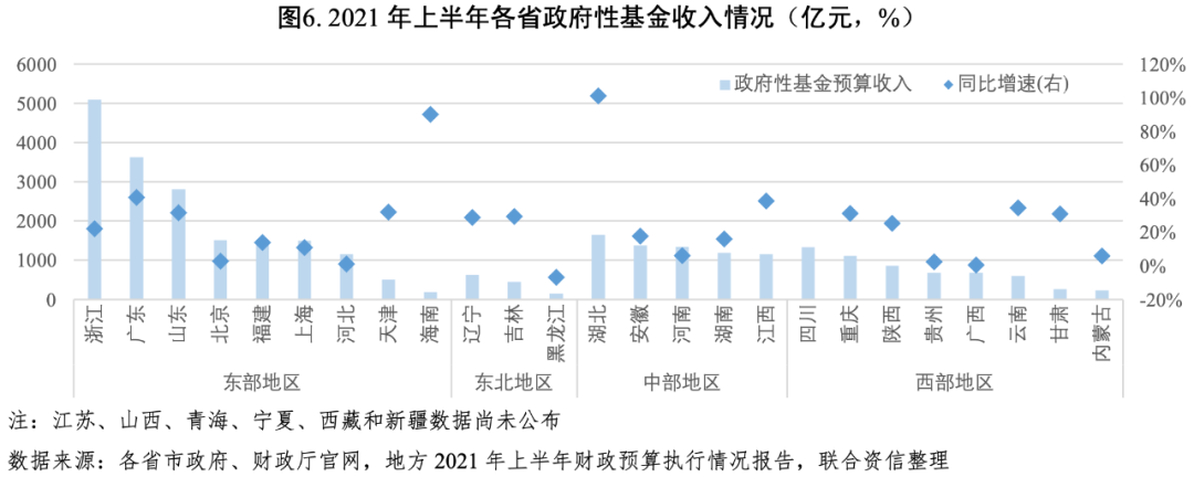 上半年各區域政府性基金收入規模分化程度較大,土地市場呈現“量縮價漲”的特點,在“雙集中”供地以及樓市調控政策的影響下,房地產企業拿地資金更集中于熱點城市,未來土地市場分化程度或將進一步加大。由于上年同期基數普遍較低,公布數據的25個省份除黑龍江外均實現正增長,13個省份實現20%以上的增速,其中浙江、廣東、山東等地在基數較大的情況下仍呈高速增長態勢。受上半年專項債發行滯后拖累,多數省份政府性基金預算支出同比有所下降,僅浙江、上海、湖北、重慶和陜西5個省份實現正增長。