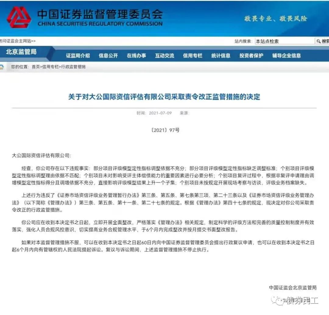 根據中國證監會北京監管局2021年7月9日披露的信息,大公國際資信評估有限公司(以下簡稱“大公國際”)被采取責令改正監管措施,主要原因是部分項目評級模型定性指標調整依據不充分、缺乏調整標準等,要求于6個月內完成整改并提交書面整改報告。