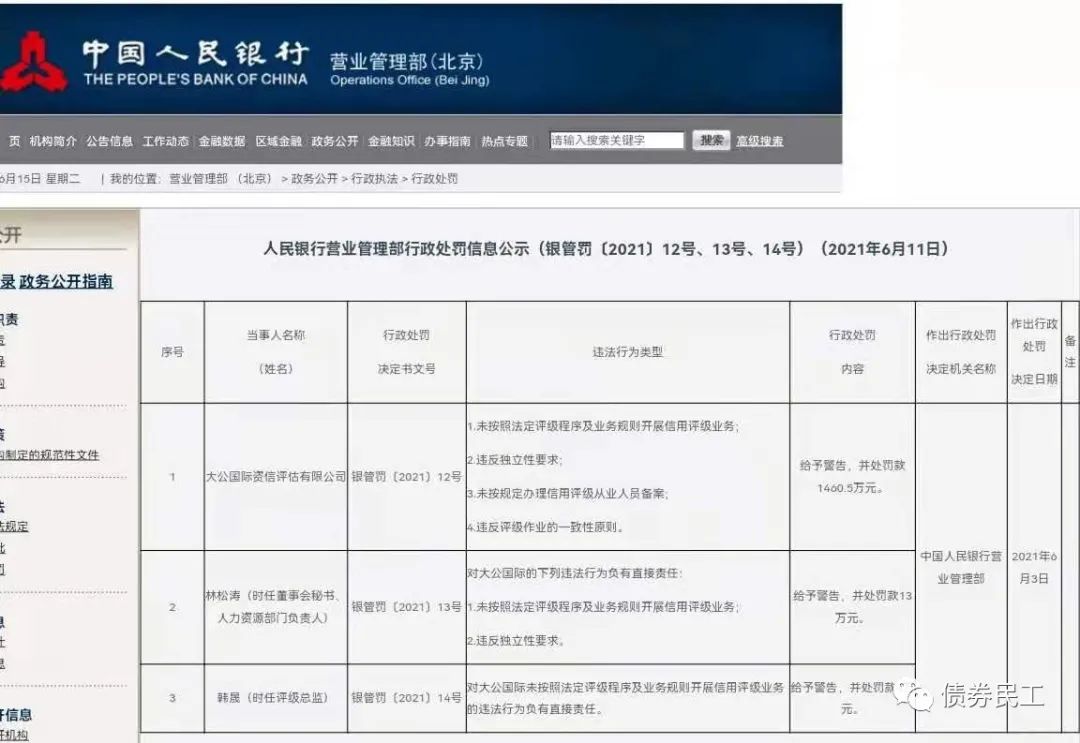 這是大公國際2021年第二次收到評級監管機構的處罰了。此前根據中國人民銀行營業管理部2021年6月的公告,大公國際被罰款1460.50萬元,主要原因是未按照法定程序開展評級業務、違反獨立性要求和違反評級作業的一致性原則等。值得注意的是,中國人民銀行營業管理部的在此次觸發中,被處罰人還包括大公國際的評級總監和董事會秘書。