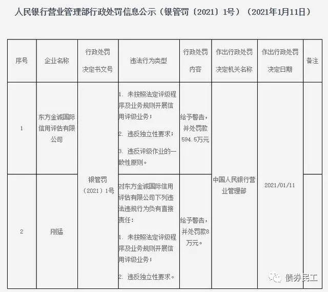 3、中國人民銀行營業管理部于2021年1月11日對東方金誠給予警告并罰款594.5萬元,主要原因是未按照法定評級程序及業務規則開展信用評級業務、違反獨立性要求和違反評級作業的一致性原則。