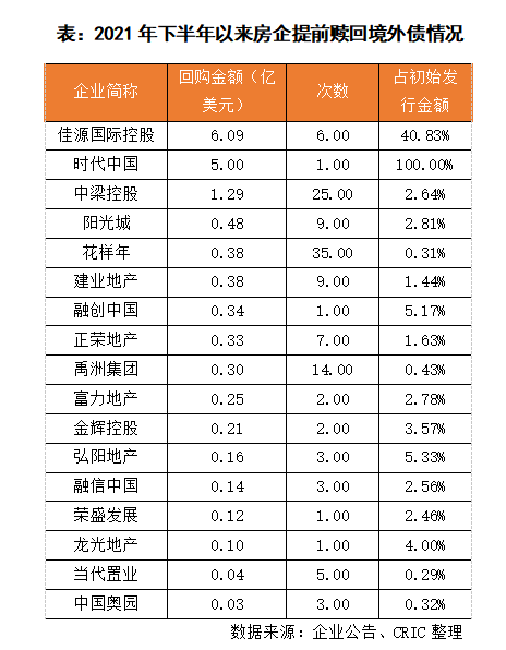在此背景下,境外債券市場重現回購潮,據不完全統計,2021年下半年以來,18家房企陸續實行境外債回購舉動,回購次數超過100次,從贖回數額來看,房企累計回購境外債券及票據涉及資金合計15.6億美元,占初始發行金額4.07%。