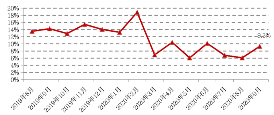 進入三季度,受熱點城市調控政策收緊、供地結構改變、“三條紅線”融資新政的多重影響,土地市場熱度明顯下降,9月CRIC重點監測的城市土地流拍率升至9.3%,較上月增加3.2個百分點,無人競拍或未達底價而流拍的地塊占到五成。