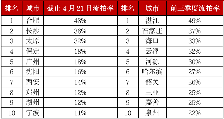 一季度流拍率較高城市