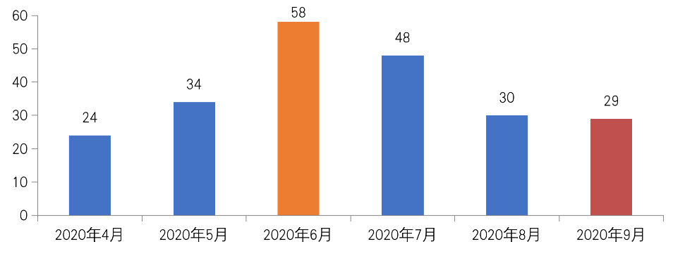 2020年至今,全國土地市場走勢曲折。一季度,因新冠肺炎爆發、多城中止或延后,土地流拍現象較2019年明顯加劇,合肥、長沙等中西部二線城市,成為流拍的“重災區”。二季度,在北京、上海、福州等熱點城市優質土地帶動下,土地市場熱度提升,溢價率明顯上揚。進入三季度,受熱點城市調控政策收緊、供地結構改變、“三條紅線”融資新政的多重影響,土地市場熱度明顯下降,溢價率已經降至二季度以來新低, 8、9兩月超百輪競拍的高熱地塊數量較6月均已經腰斬,“秋涼”已現。