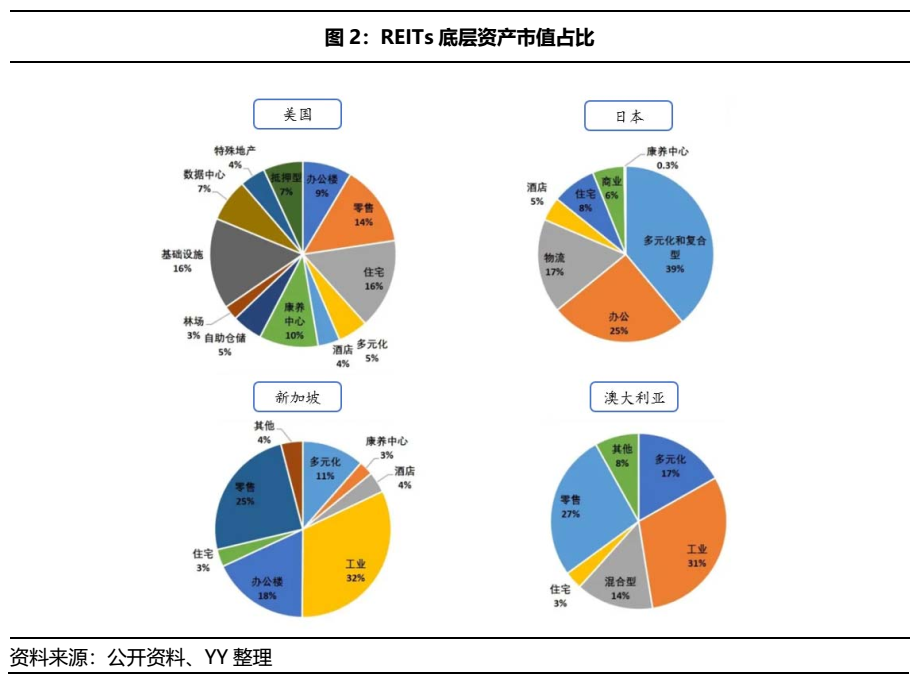 境外成熟的REITs市場,大多始于商業地產,且成為各國REITs的主流業態。從下圖可以看出,美國、日本、新加坡和澳大利亞等國家中,住宅、零售、辦公、酒店等商業地產REITs的市值占比幾近半數。