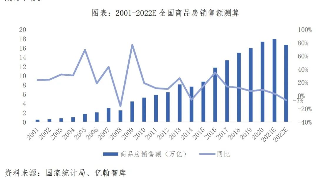 2001年以來,房地產開發投資同比增速從未出現過負增長,最差的一年出現在2015年,同比增速為0.9%。但是在隨著新開工預期的下降,商品房市場成交量預期看衰,開發投資或將在2022年首次出現負增長。