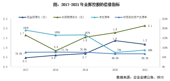 截至2021年末金輝有息負債527.94億元,較年初減少1.82%,其中短債規(guī)模同比大幅減少13.03%至167.97億元,短債占比下降至31.81%,債務(wù)結(jié)構(gòu)有所優(yōu)化,但仍有進一步的提升空間。金輝持有現(xiàn)金較年初減少25.81%至197.28億元(已抵押存款占比4.31%),降幅較大但可動用現(xiàn)金基本覆蓋短債。期末金輝“三條紅線”指標維持綠檔,現(xiàn)金短債比1.17,凈負債率較年初增加12.7pct至88%,剔除預(yù)收后的資產(chǎn)負債率改善至68.5%。