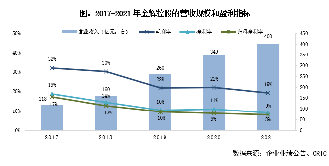 值得注意的是,2021年高權(quán)益比的并表項目陸續(xù)進入結(jié)轉(zhuǎn),導(dǎo)致金輝少數(shù)股東損益占比同比減少6.77pct至11.34%,實現(xiàn)歸母凈利潤32.75億元,同比增長4.71%,對應(yīng)歸母凈利率8.18%,同比減少0.8pct,利潤率仍有待提升。