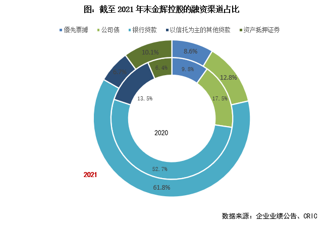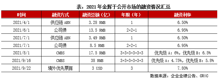 信用風(fēng)險減少和融資渠道通暢,一定程度反映在金輝2021年新發(fā)行的債券上。全年金輝于公開市場融資活躍,上半年成功發(fā)行2021年第一期小公募和第一期供應(yīng)鏈ABN ,7-8月成功發(fā)行2021年第二期小公募、第二期供應(yīng)鏈ABN以及CMBS,9月發(fā)行一筆CMBS以及境外優(yōu)先票據(jù),融資渠道逐漸拓展。年內(nèi)金輝加權(quán)平均融資成本6.58%,較去年同期的7.47%改善顯著。截至2021年末,三大國際評級機構(gòu)均維持金輝控股長期發(fā)行人主體評級不變,標普給予B+/穩(wěn)定,穆迪B1/穩(wěn)定,惠譽B+/穩(wěn)定。