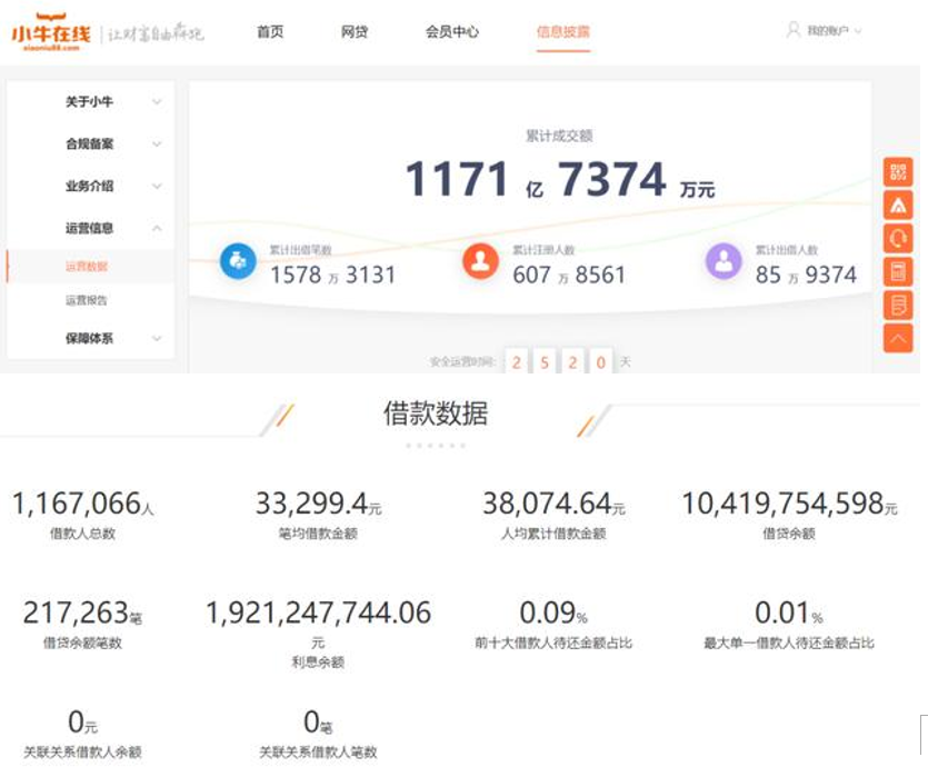 彼時(shí)小牛在線官網(wǎng)實(shí)時(shí)數(shù)據(jù)顯示,平臺(tái)累計(jì)成交額已達(dá)1171.74億元,累計(jì)出借筆數(shù)1578.3萬筆,注冊(cè)人數(shù)超608萬,出借人數(shù)85.94萬;借貸余額104.2億元,僅利息余額就多達(dá)19.2億元。