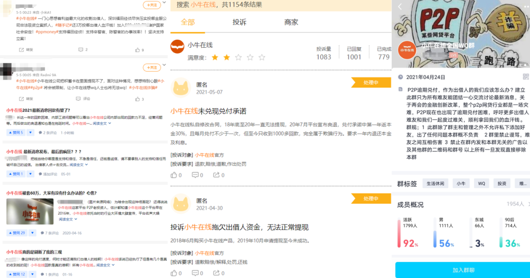 為追討欠款,許多投資者“報(bào)團(tuán)取暖”,創(chuàng)建或加入了小牛在線維權(quán)群。雷達(dá)財(cái)經(jīng)搜索發(fā)現(xiàn),有維權(quán)群中維權(quán)者多達(dá)1954人,其他名為“回款交流群”、“堅(jiān)持到底群”、“難友集中營(yíng)”的群友也多達(dá)數(shù)百人,但相關(guān)群主并不希望接受采訪,“我們有自己的維權(quán)方式。”