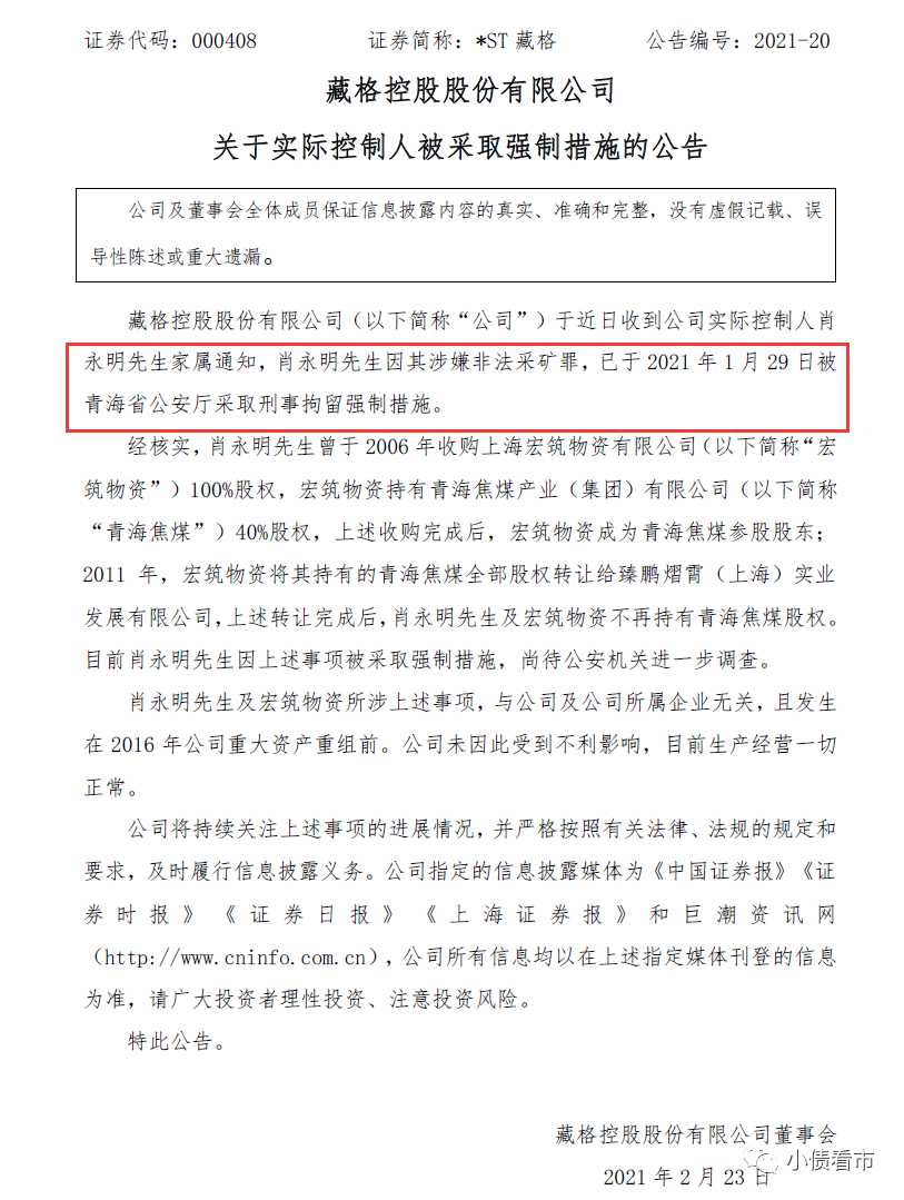 2月22日晚間,*ST藏格(000408.SZ)公告稱,公司實(shí)際控制人肖永明因其涉嫌非法采礦罪,已于2021年1月29日被青海省公安廳采取刑事拘留強(qiáng)制措施。