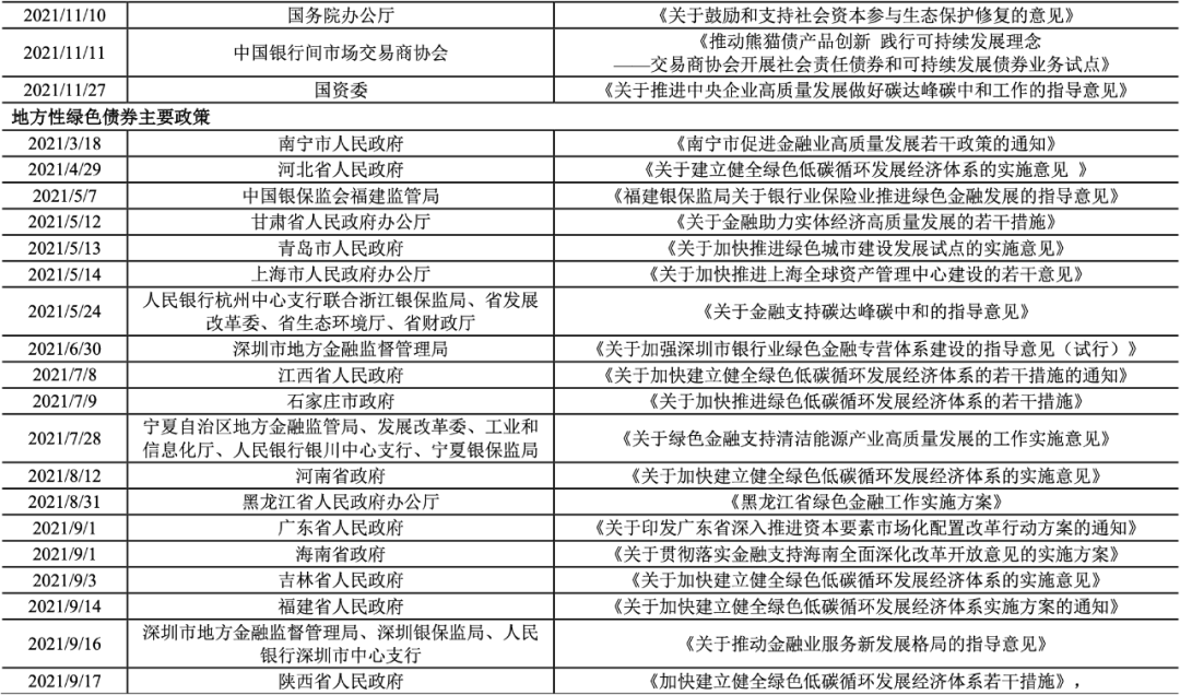 支持多領域綠色債券發行和擴容。2021年1月4日,國家發改委等十部門印發《關于推進污水資源化利用的指導意見》,指出鼓勵企業采用綠色債券、資產證券化等手段,依法合規拓寬融資渠道,推動我國污水資源化利用實現高質量發展。2021年2月22日,國務院印發《關于加快建立健全綠色低碳循環發展經濟體系的指導意見》,指出大力發展綠色金融,發展綠色直接融資,加大對金融機構綠色金融業績評價考核力度。2021年7月27日,發改委等三部委發布《關于鼓勵家電生產企業開展回收目標責任制行動的通知》,指出將完成回收目標并達到國家有關管理要求的責任企業納入家電生產企業“綠色責任名單”,在企業發行綠色債券、綠色信貸審批時優先支持。2021年8月18日,央行等六部委發布《關于推動公司信用類債券市場改革開放高質量發展的指導意見》(以下簡稱《意見》)指出,擴大“雙創”債券、綠色債券發行規模。2021年9月12日,中共中央辦公廳和國務院辦公廳印發《關于深化生態保護補償制度改革的意見》,指出拓展市場化融資渠道,鼓勵符合條件的非金融企業和機構發行綠色債券。2021年9月22日,國務院發布《關于完整準確全面貫徹新發展理念做好碳達峰碳中和工作的意見》,指出支持符合條件的企業上市融資和再融資用于綠色低碳項目建設運營,擴大綠色債券規模。2021年10月18日,國家發改委等四部委聯合發布《關于嚴格能效約束推動重點領域節能降碳的若干意見》,指出拓展綠色債券市場的深度和廣度,支持符合條件的節能低碳發展企業上市融資和再融資。2021年10月24日,國務院印發《2030年前碳達峰行動方案》,指出大力發展綠色債券等金融工具,拓展綠色債券市場的深度和廣度,有助于推動綠色債券市場擴容。2021年11月2日,中共中央、國務院發布《關于深入打好污染防治攻堅戰的意見》,指出大力發展綠色信貸、綠色債券、綠色基金,加快發展氣候投融資,強化對金融機構的綠色金融業績評價。2021年11月10日,國務院辦公廳發布《關于鼓勵和支持社會資本參與生態保護修復的意見》,指出推動綠色基金、綠色債券、綠色信貸、綠色保險等加大對生態保護修復的投資力度;積極支持符合條件的企業發行綠色債券,用于生態保護修復工程。2021年11月27日,國資委印發《關于推進中央企業高質量發展做好碳達峰碳中和工作的指導意見》,指出積極發展綠色金融,有序推進綠色低碳金融產品和服務開發,拓展綠色債券的業務范圍。中央和各部委多次發文有助于拓寬不同領域綠色低碳企業的融資渠道,推動相關領域綠色債券發行。