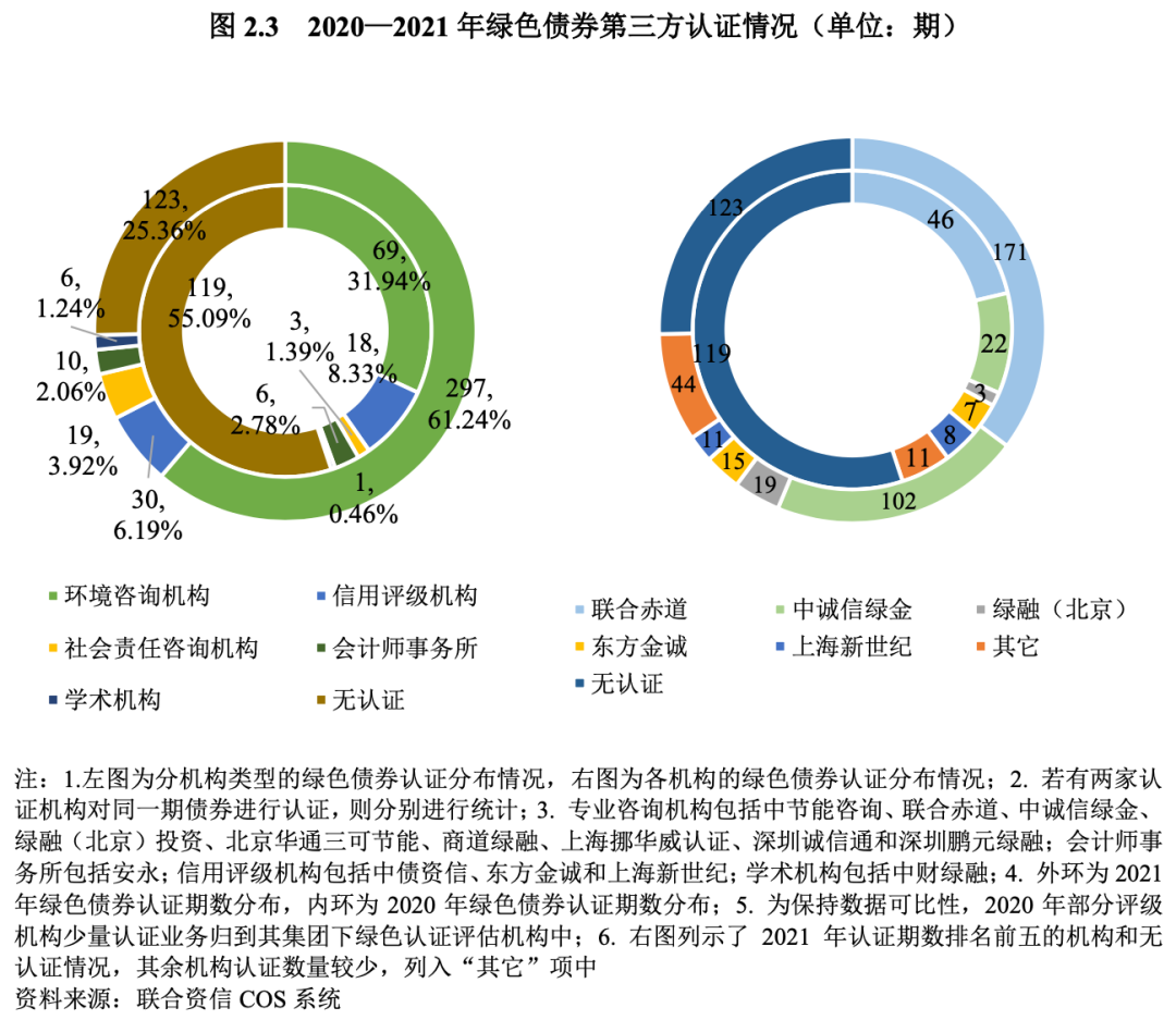 2021年共有362期綠色債券進行第三方評估認證,其中專業咨詢機構、信用評級機構占據了主要市場份額,共為346期綠色債券提供第三方認證,在進行第三方認證的綠色債券總期數中的占比高達95.58%。與上年相比,專業咨詢機構進行認證的綠色債券在進行第三方認證綠色債券總期數的占比(87.29%)較上年(74.22%)有所上升,信用評級機構進行認證的綠色債券在進行第三方認證綠色債券總期數的占比(8.29%)較上年(18.56%)有所下降,會計師事務所進行認證的綠色債券在進行第三方認證綠色債券總期數的占比(2.76%)較上年(6.19%)有所下降。具體來看,為綠色債券提供第三方認證最多的機構為聯合赤道、中誠信綠金和綠融(北京),分別認證了171期、102期和19期。