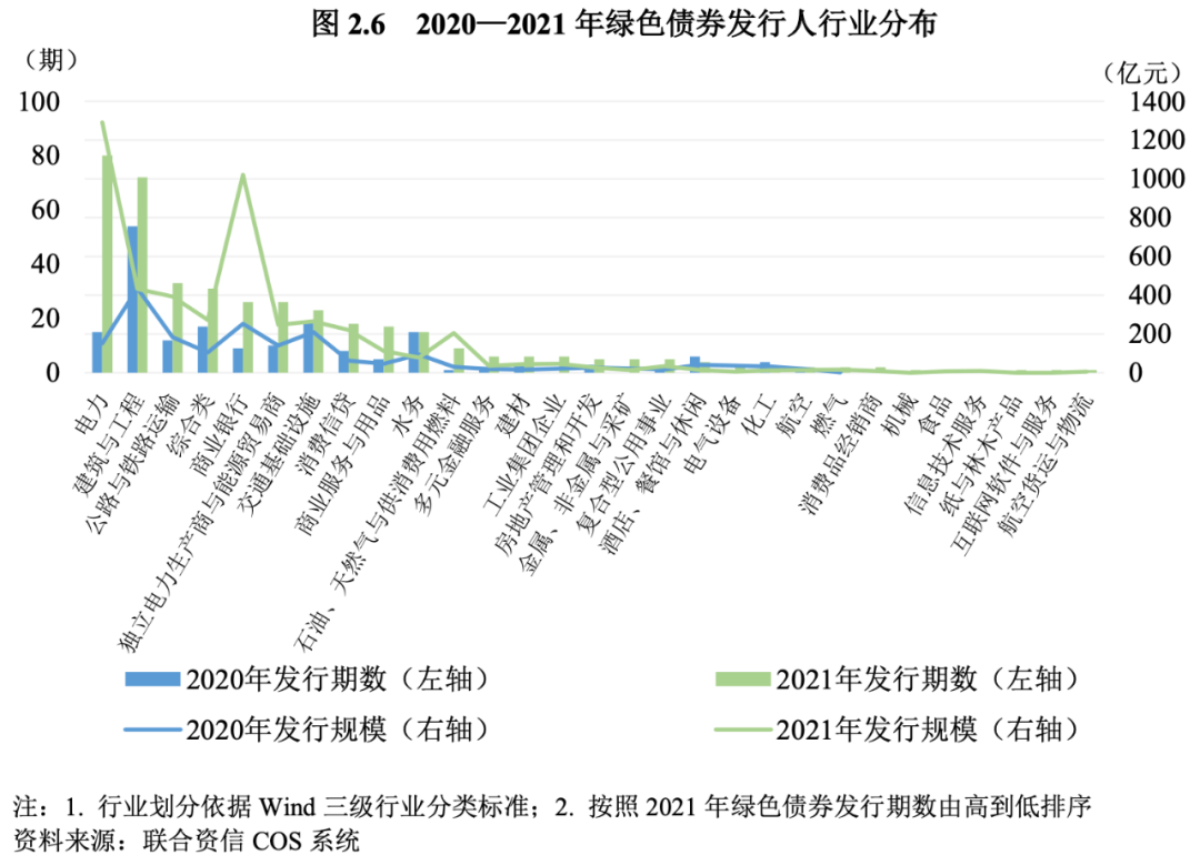 2021年,我國綠色債券發行主體共涉及電力、建筑與工程、水務等在內的29個行業,相比去年新增10個行業[10],發行主體行業分布更為廣泛。其中,電力行業企業所發綠色債券期數80期,較上年同期增長433.33%,位列第一位,發行人家數和發行規模分別為34家和1291.60億元,均較上年大幅增長;建筑與工程行業企業發行綠色債券期數72期,較上年同期增長33.33%,位列第二位,發行家數(53家)較上年同期增長26.19%,發行規模(432.86億元)較上年同期(435.60億元)略有下降;公路與鐵路運輸行業企業發行綠色債券期數33期,較上年同期(12期)增長175.00%,位列第三位,發行家數和發行規模(12家、393.80億元)較上年同期(7家、184.00億元)顯著增長。