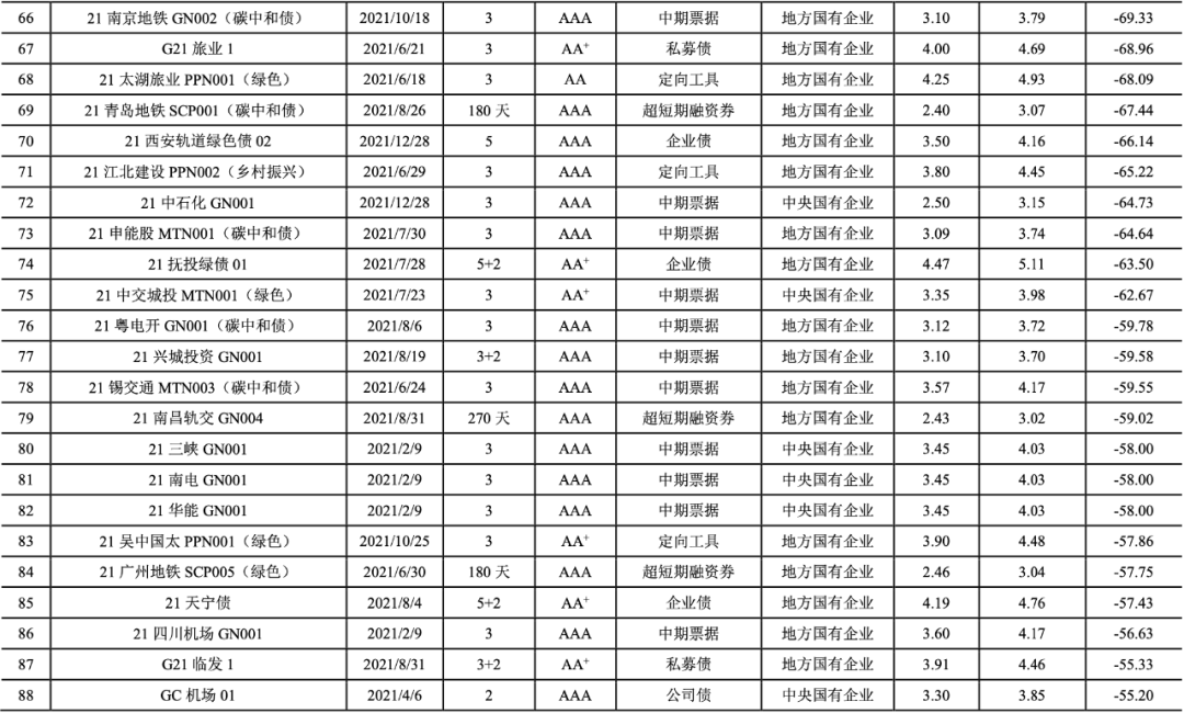 2021年,我國共有247期綠色債券的發行利率低于可比債券[14]的平均發行利率(詳見附表2),占比達到72.01%。2021年具有成本優勢的綠色債券的加權平均息差[15]為-24.64BP。具有成本優勢的綠色債券以國有企業(241期)為主,民營企業4期,公眾企業2期。