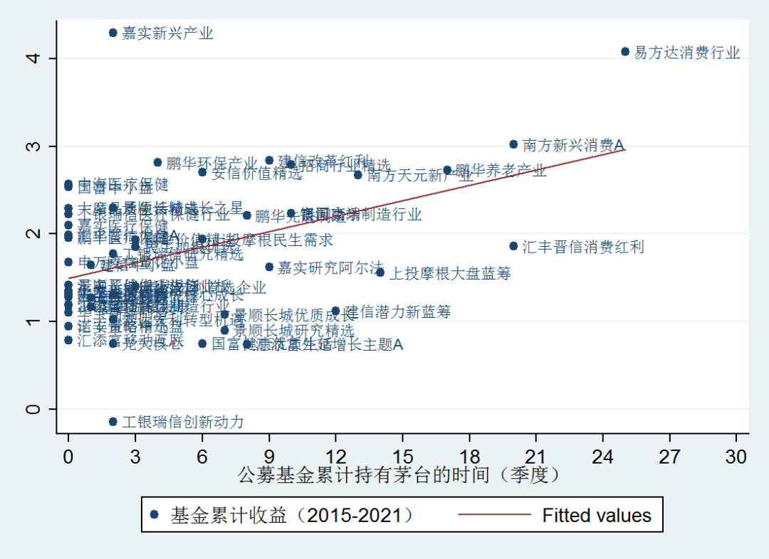 套用索羅斯的名言,不要告訴我你對了,關(guān)鍵是你是否拿得住。圖1展示了,公募股票基金持有茅臺的時間和基金的業(yè)績的關(guān)系。
