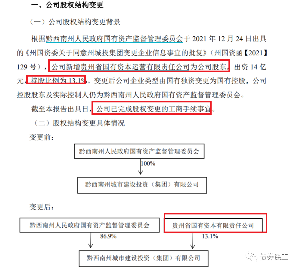 根據黔西南州城市建設投資(集團)有限公司(以下簡稱“黔西南城投”)2022年1月5日的公告,貴州省國有資本運營有限責任公司出資14億元,成為持有公司13.1%股權的股東。黔西南城投的實際控制人未發生變更,仍然是黔西南州國資委,目前已完成了股權變更工商手續。黔西南城投的主體信用等級為中誠信國際AA。