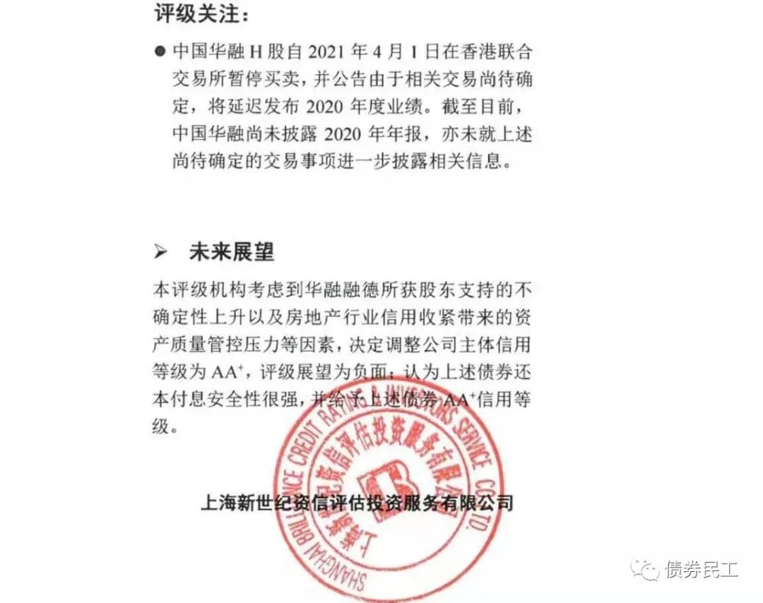 根據最新的跟蹤評級報告,華融融德資產管理有限公司(以下簡稱“華融融德”)的主體信用評級由AAA下調至AA+,評級展望為負面。華融融德的評級展望在2021年4月16日已經被調整為負面。