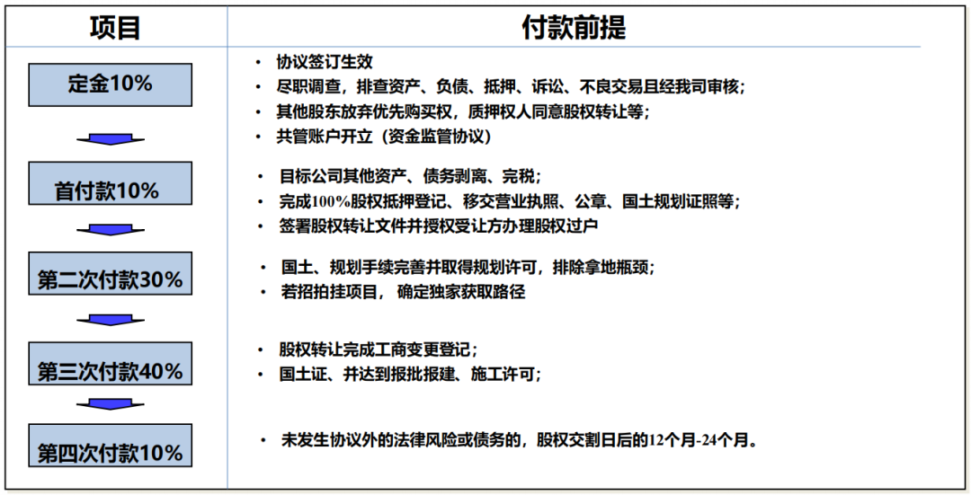 在收并購(gòu)項(xiàng)目中,一般會(huì)將對(duì)價(jià)分多批次支付,通過(guò)共管+解付條件控制每一筆資金支出。所謂不見兔子不撒鷹,每一筆款項(xiàng)支付必須結(jié)合關(guān)鍵節(jié)點(diǎn)+得到對(duì)等的權(quán)益。如涉及到需要我方先付的情況,則必須要求對(duì)方足額擔(dān)保。