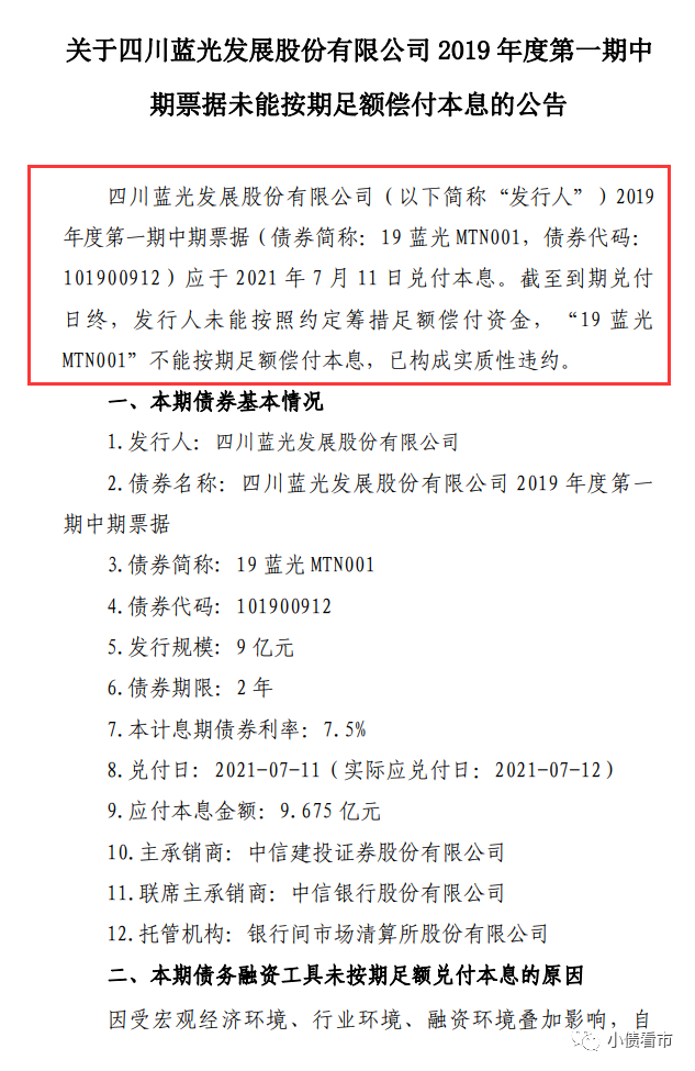 據(jù)公開資料,“19藍(lán)光MTN001”發(fā)行于2019年7月,發(fā)行總額9億元,票面利率7.5%,應(yīng)于2021年7月11日到期,應(yīng)付本息9.675億元。