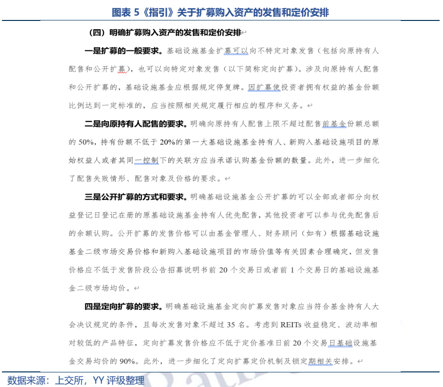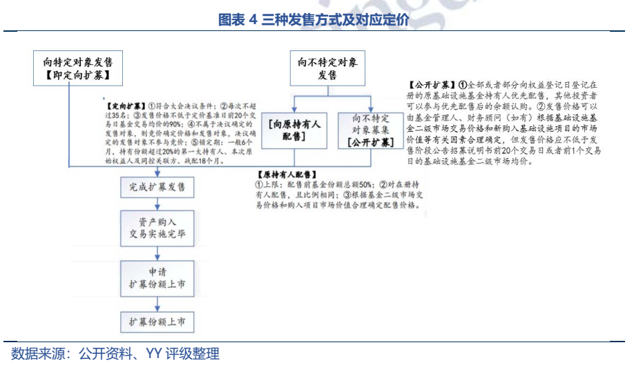 從《指引》來看,主要是三種發(fā)售方式,向原持有人配售、公開擴募及定向擴募;和初始發(fā)行不同的是,不再設詢價定價機制,主要通過管理人定價、持有人大會決議的方式予以確定。