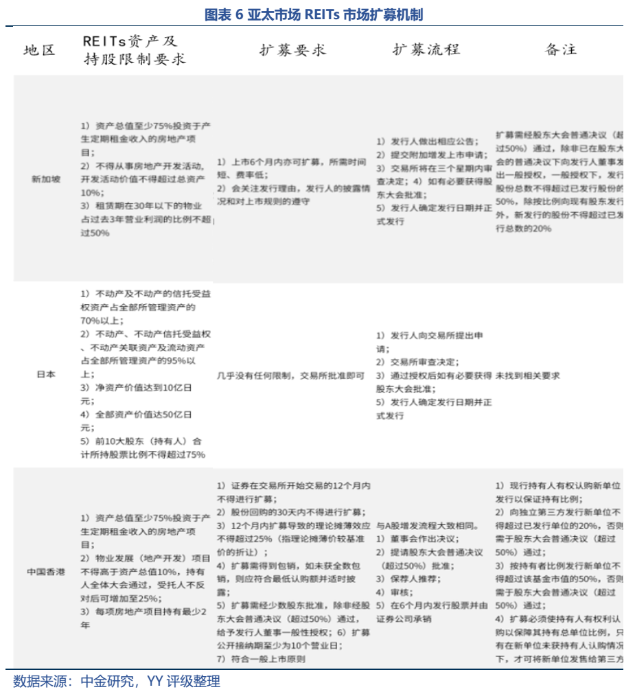 這邊僅對相對成熟的境外REITs市場(主要是亞太市場)的擴募機制進行比較,可以發(fā)現(xiàn)亞太市場的REITs擴募機制整體較為簡單。1)對于擴募項目本身,對于規(guī)模、質量及權屬問題上,沒有特別要求,且從第三方收購資產(chǎn)是海外REITs擴募的通常做法;2)對于擴募時間,日本是交易所批準即可,最為寬松,而中國香港是首次交易日起的12個月內(nèi)和份額回購的30日內(nèi)不得擴募。3)對關于擴募流程,新加坡、日本及中國香港整體類似于一般股票的增發(fā)流程,管理層發(fā)起——向交易所提起申請——確定方案——交易執(zhí)行這樣的步驟進行。而根據(jù)《指引》和上文,我國的擴募程序也基本類似。