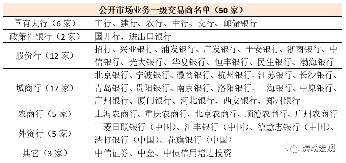 央行會在每年的4月底公布最新年度的公開市場業務一級交易商名單。最新的公開市場業務一級交易商名單有50家