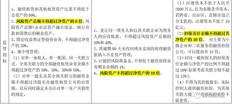 (2)此外為限制風險的集中,政策還在業務集中度給予了明確限制。具體來看,對融資租賃公司,要求對單一承租人、單一集團、同一關聯方式、全部關聯方的全部融資租賃業務余額;對商業保理公司,要求受讓同一債務人和以其關聯企業為債務人的應收賬款,不得超過風險資產總額的50%和40%;對融資擔保公司,要求對同一被擔保人的擔保責任余額與凈資產的比例不得超過10%(如果考慮關聯方則不超過15%)。