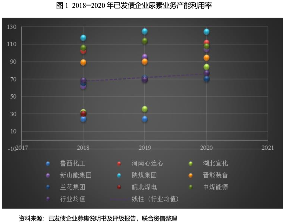 通過下圖已發(fā)債尿素企業(yè)的產(chǎn)能利用率分布可以看出,2018年,魯西化工、湖北宜化、新山能集團、山西蘭花煤炭實業(yè)集團有限公司(以下簡稱“蘭花集團”)和安徽省皖北煤電集團有限責任公司(以下簡稱“皖北煤電”)尿素產(chǎn)能利用率均低于行業(yè)均值。皖北煤電的子公司安徽淮化集團有限公司已于2018年停產(chǎn)整頓,后期不再生產(chǎn)尿素。