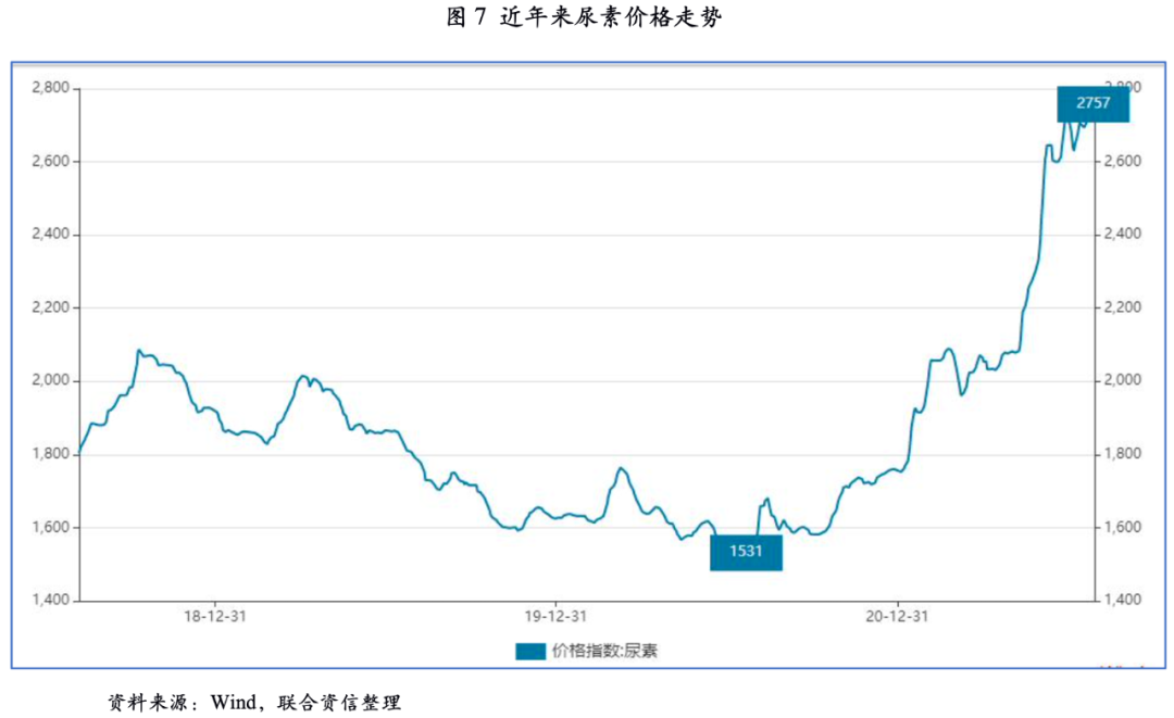 但受全球疫情持續(xù)爆發(fā)影響,尿素出口減少,尿素市場供大于求導致4月份開始價格下降并于2020年7月底達到最低點。隨后尿素價格在印度招標、行業(yè)檢修和環(huán)保限產(chǎn)以及工業(yè)用肥需求增長等因素的帶動下開啟了快速上漲模式,2021年5月后期,由于上游無煙煤價格大幅上漲導致尿素價格大幅攀升,目前尿素價格屬于歷史高位。未來,尿素農(nóng)業(yè)需求及工業(yè)需求有望提高;同時若尿素固定床裝置淘汰政策落實到位,尿素供給將會收縮,產(chǎn)品價格有望得到支撐。