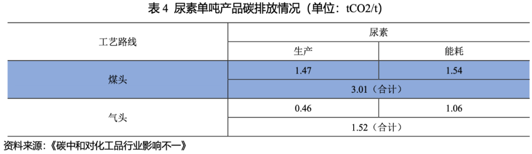 從化學反應過程來看,煤化工是通過化學手段將原料煤中絕大部分的碳轉化為另一種能源型產(chǎn)品及含碳化學品,在生產(chǎn)過程中會排放部分二氧化碳;同時,煤化工在電力和熱力供應上會使用燃料煤,進而會有能耗排放。單噸煤頭尿素產(chǎn)品在生產(chǎn)過程中將排放二氧化碳1.47噸,生產(chǎn)能耗過程中排放二氧化碳1.54噸;合計排放3.01噸。單噸氣頭尿素在生產(chǎn)過程中將排放二氧化碳0.46噸,能耗過程中排放1.06噸,合計排放1.52噸。總體看,氣頭尿素碳排放量較少,煤頭尿素碳排放量較多。氣頭尿素和煤頭尿素能耗產(chǎn)生的碳排放量均大于碳轉換過程中的碳排放。