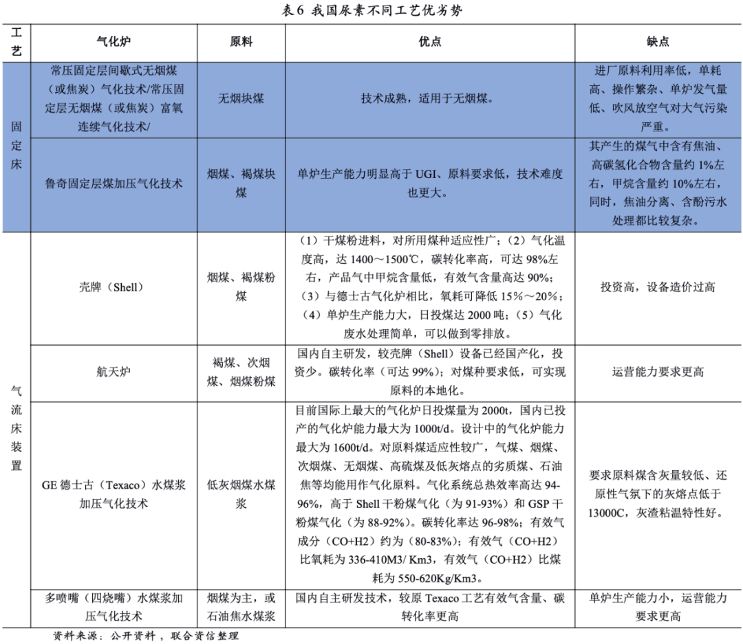 當前煤制尿素煤化工生產(chǎn)裝置主要分為兩類,一種是固定床裝置,一種是氣流床裝置。其中氣流床從進料方式上又可以分為干法(干粉進料)和濕法(水煤漿進料)。干法氣化裝置目前在國內(nèi)應用較多的主要有殼牌(Shell)和航天爐;濕法氣化裝置目前在國內(nèi)應用較多的有GE德士古(Texaco)、四噴嘴等,這些氣化爐在原材料、能耗、碳轉化率、投資規(guī)模等各方面均不同,具體優(yōu)劣勢如下表所示。