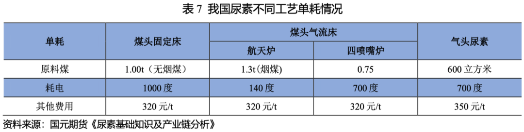 在無煙煤為原料的裝置下,生產(chǎn)1噸尿素,需消耗無煙煤1噸左右,100公斤左右的動力煤,1000度左右的電。在煙煤原料的裝置下,航天爐裝置消耗的煙煤為1.3~1.5噸,耗電量140~200度電;四噴嘴氣化爐裝置消耗的煙煤為0.75~0.79噸,耗電量控制在700~1000度電。氣頭尿素的生產(chǎn)成本主要由天然氣價格、電費和加工費組成,生產(chǎn)1噸尿素需消耗600~800立方米天然氣。