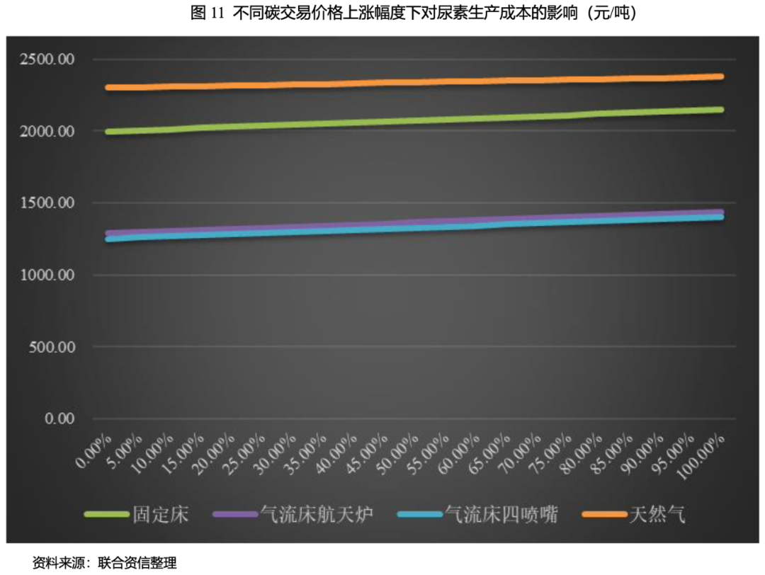 假設在其他期間費用、原材料價格(煙煤、無煙煤及天然氣基礎價格采用2016年以來的市場平均價格,分別為576.38元/噸、1027.92元/噸和2.54元/立方米)以及電價為0.5元/度不變,在碳交易起始價格50元/噸(自7月份全國碳市場交易啟動以來,全國碳配額價格一直維持在50元/噸以上,期間最高價曾超過60元/每噸,因此下文假設碳交易成本為50元/噸作為起始成本),不同工藝下尿素的生產(chǎn)成本上漲幅度如下表所示。同時,通過不同碳交易價格測算出不同工藝的生產(chǎn)成本如下圖所示。通過測算可以看出天然氣對碳交易價格的敏感性最高,固定床裝置對碳交易價格的敏感性最低。雖然煤頭尿素的碳排放量遠高于氣頭尿素,但碳交易后煤頭尿素企業(yè)的單噸生產(chǎn)成本仍低于氣頭尿素。整體看,碳交易成本對尿素生產(chǎn)成本的敏感性較低。