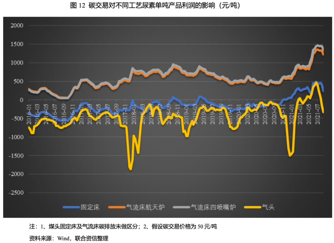 通過上文測算發(fā)現(xiàn)原材料價格變動對尿素的生產(chǎn)成本影響很大,因此不同原材料價格下碳交易后能否實現(xiàn)盈利至關重要。下圖選取2016年以來不同原料的歷史數(shù)據(jù)以及尿素價格的歷史數(shù)據(jù),通過尿素碳交易后單噸利潤公式(碳交易后單噸利潤=尿素價格–尿素成本–碳交易成本)測算可以看出氣頭尿素利潤<煤頭固定床裝置利潤<煤頭氣流床裝置利潤,雖然煤頭尿素的碳排放量遠高于氣頭尿素,但煤頭尿素企業(yè)的單噸利潤仍高3于氣頭尿素,主要系我國天然氣資源緊張,氣頭尿素的原料成本較高所致。同時,煤頭氣流床工藝基本均實現(xiàn)了盈利,氣流床航天爐裝置和氣流床四噴嘴爐裝置的單噸利潤差距不大,天然氣及固定床工藝產(chǎn)生虧損的可能性很大。因此,煤頭氣流床工藝在碳交易后優(yōu)勢顯著,其中氣流床航天爐裝置和氣流床四噴嘴爐裝置的優(yōu)勢相當。整體看,雖然煤頭尿素的碳排放量遠高于氣頭尿素,但碳交易后煤頭尿素企業(yè)的單噸利潤仍高于氣頭尿素,采用煤頭氣流床工藝的企業(yè)更具優(yōu)勢。在當前碳交易價格下,煤頭氣流床尿素單噸利潤仍較好,尿素企業(yè)的減碳動力不足。