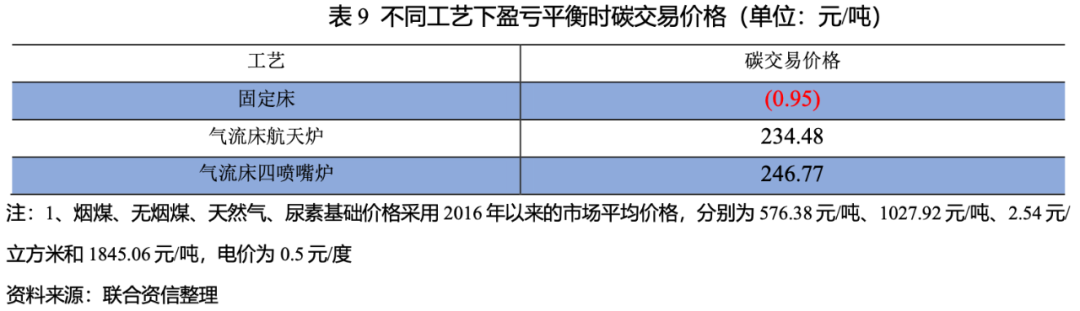 當前我國電力供給主要有光伏、風電、火電及核電,下文假設尿素生產(chǎn)過程中電力及熱能主要通過光伏、風電、火電三種方式自供。風電及光伏自供的度電成本采用市場上風電或光伏企業(yè)2016-2020年的度電營業(yè)收入–度電凈利潤平均值測算,火電自供的度電成本采取上網(wǎng)電價測算。同時,光伏及風電作為清潔能源,在能耗產(chǎn)生過程中的碳排放量為零;進而考慮在碳交易(假設碳交易成本為50元/噸)的背景下,測算不同能源供應下碳交易后成本及利潤情況。從下表可以看出,風電的度電成本較低,不同工藝下均具有成本優(yōu)勢,其中氣流床四噴嘴爐裝置的生產(chǎn)成本最低。光伏因為度電成本較高,不同工藝下生產(chǎn)成本均高于火電及風電的能源供應方式;而氣流床航天爐裝置和氣流床四噴嘴爐裝置的生產(chǎn)成本相當。在考慮碳排放-碳交易后可以看出,風電作為能源供應的方式成本優(yōu)勢更為明顯。光伏作為能源供應的方式下,氣流床航天爐裝置的成本優(yōu)勢大于火電,其他工藝仍然不及火電;但是隨著碳交易成本提升,光伏作為能源供應的方式成本優(yōu)勢均大于火電。整體看,風電基于其較低的度電成本及清潔性導致碳排放量較少進而具有很大的優(yōu)勢,但是尿素企業(yè)就地獲取風電資源的難度較大。光伏資源清潔性較好,但度電生產(chǎn)成本較高,在碳交易價格低于70元/噸時,優(yōu)勢不太明顯。但是未來隨著碳排放指標的逐步收緊,碳交易價格或將持續(xù)提升,光伏作為清潔能源將替代火電資源成為尿素企業(yè)的主要能源供應來源。