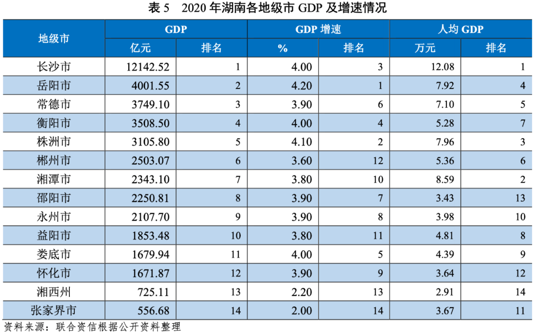湖南省長株潭地區(qū)、湘南地區(qū)、湘北地區(qū)和湘西地區(qū)經(jīng)濟(jì)實(shí)力分化程度較高,長株潭地區(qū)經(jīng)濟(jì)實(shí)力明顯高于其他地區(qū),湘西地區(qū)經(jīng)濟(jì)實(shí)力較弱;長沙市作為湖南省省會城市,經(jīng)濟(jì)實(shí)力及增速均處于全省領(lǐng)先地位,為全省唯一GDP規(guī)模超萬億的地級市。