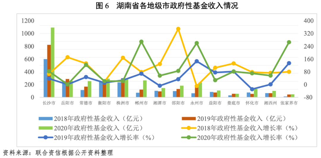 政府性基金收入方面,長沙市的政府性基金收入規(guī)模位于全省首位,達(dá)到1093.41億元,占湖南省政府性基金收入的32.24%;岳陽市、常德市、衡陽市、株洲市、郴州市及永州市政府性基金收入規(guī)模在200~300億元之間,邵陽市、懷化市、益陽市和湘西州政府性基金收入規(guī)模在100~200億元之間,其他地級市政府性基金收入規(guī)模較小,不足100億元。2020年,各地級市政府性基金收入均呈現(xiàn)不同程度的增長,其中常德市、郴州市、永州市和張家界市增幅很大,均超過120%。