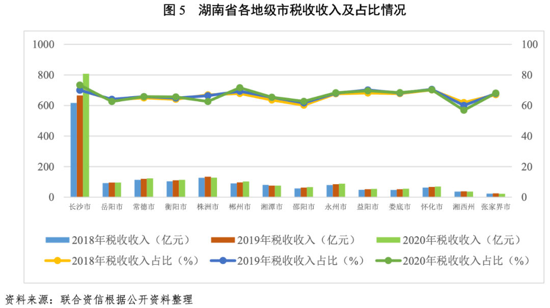 從一般公共預(yù)算收入結(jié)構(gòu)來看,2020年除岳陽市、株洲市、益陽市、懷化市和湘西州的稅收收入占比較2019年有所下降外,其余地級市稅收收入占比均有不同幅度的上升。懷化市、郴州市和長沙市稅收收入占比均突破70%,其他地級市(除湘西州外)稅收占比均在60%~70%之間。整體上,湖南省各地級市一般公共預(yù)算收入的穩(wěn)定性較強(qiáng)。