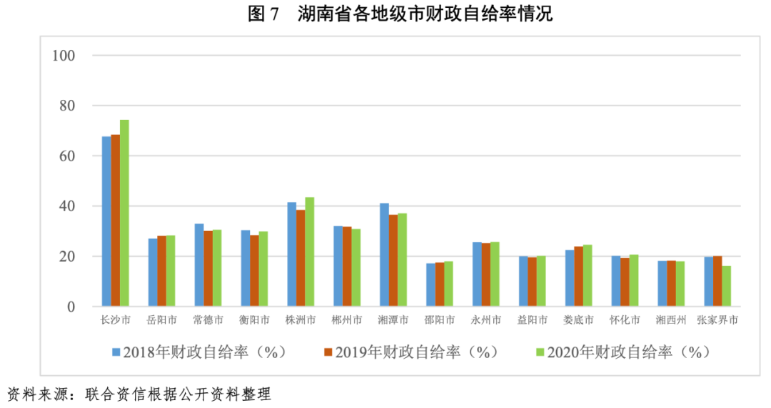 財政自給率方面,2020年除長沙市財政自給率為74.32%外,其他各地級市財政自給率均未超過45%,其中湘西州、邵陽市及張家界市財政自給率最低,均未超過20%。2020年,除郴州市和湘西州財政自給率有所下降外,其他地級市財政自給率均呈現(xiàn)一定的增長。總體看,長沙市財政自給能力較強(qiáng),其他各地級市財政自給能力弱。