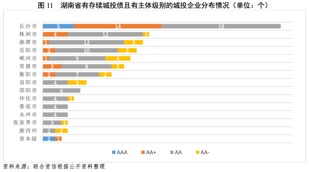 從主體信用級別區(qū)域分布看,湖南省城投企業(yè)中AAA主體共7家,集中在省本級和長沙市;AA+級城投企業(yè)28家,主要分布在長沙市、株洲市和常德市;AA級城投企業(yè)104家,占湖南省發(fā)債城投企業(yè)數(shù)量的64.60%。高信用級別城投企業(yè)集中在湖南省長株潭地區(qū),湘西地區(qū)信用水平普遍偏低。